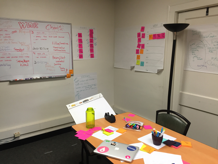 Utilizing interviews with veterans, I had to utilize active listening to really get the details of their stories and take notes on what emotions they demonstrated. Through these interviews I was able to formulate, along with my design colleague from the team, a focus around the sensory response to situations that seemed to relate across all stories. While each veteran’s story is different, there emerged some similar emotional patterns that I noticed, which is what became the focus questions that the team could always check our design against: