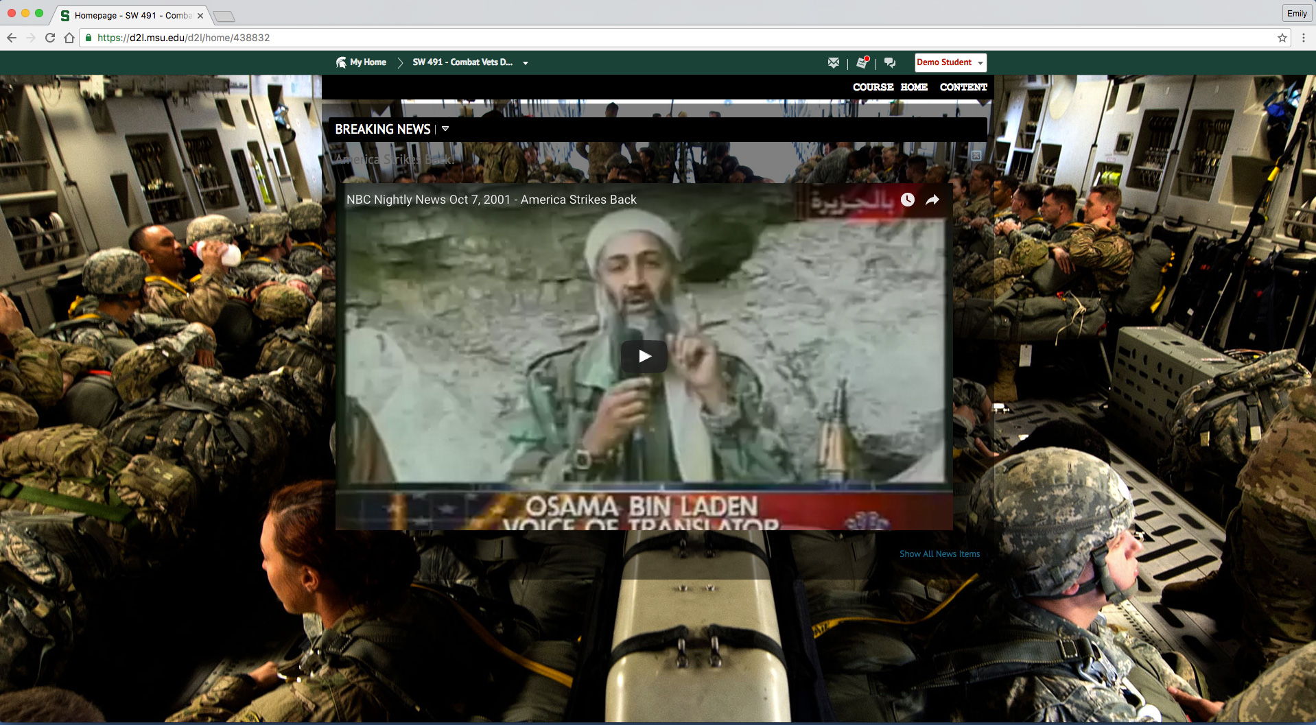 The lead instructor was charged with creating a fully-online learning experience for social work students around the experiences of combat veterans. While extremely passionate on the subject but not knowing at all where to begin on this journey, she approached me with the challenge of “I want this to be different…I don’t want this to be another academic course. I want students to care. I want them to truly understand and empathize with these veterans. How can we get them to care?”