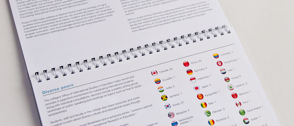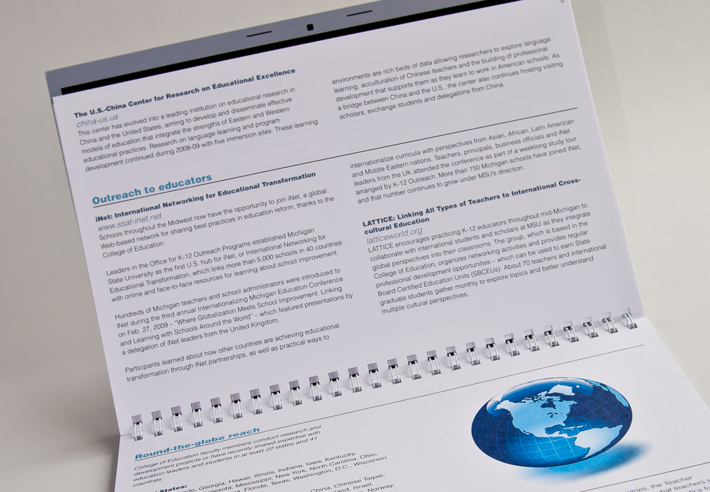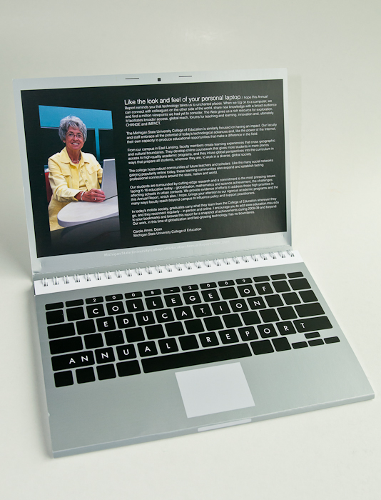 The College of Education at Michigan State University had made a lot of technological advancements during the year, so I felt it was appropriate to construct the annual report around this theme. The result is an annual report shaped like a laptop, which folds open with a spiral bind allowing the reader to flip through sections easily.